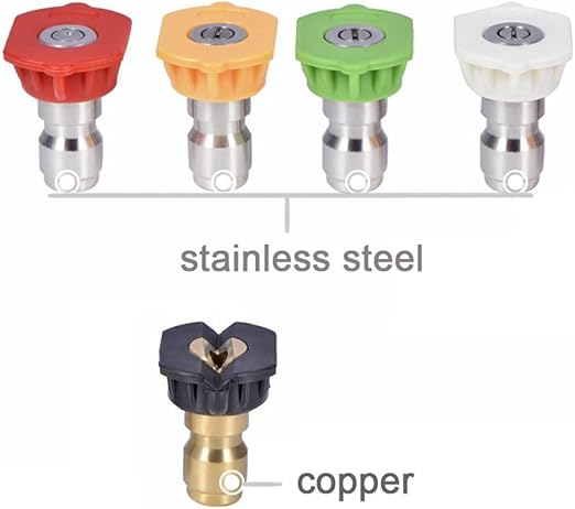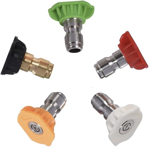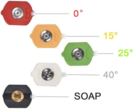 About this itemComplete set Twinkle Start Pressure Washer Tips contains 1 Black Brass soap nozzle1 Red Stainless Steel Nozzle Tip 0 Degree1 Yellow Stainless Steel Nozzle Tip 15 Degree1 Green Stainless Steel Nozzle Tip 25 Degree1 White Stainless Steel Nozzle Tip 40 DegreeHigh quality Our Pressure Washer Nozzle Tips are constructed from highquality stainless steel and brassPressure Washers rated 14 inch quick connection design 25 GPM up to 4000 PSIDifferent jet anglesYou can choose jet nozzles with different angles according to actual needsClean easily allows you to clean hardtoreach areas quickly and easily without a ladder making them the perfect Power Washer Nozzle Tips See more product details